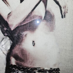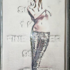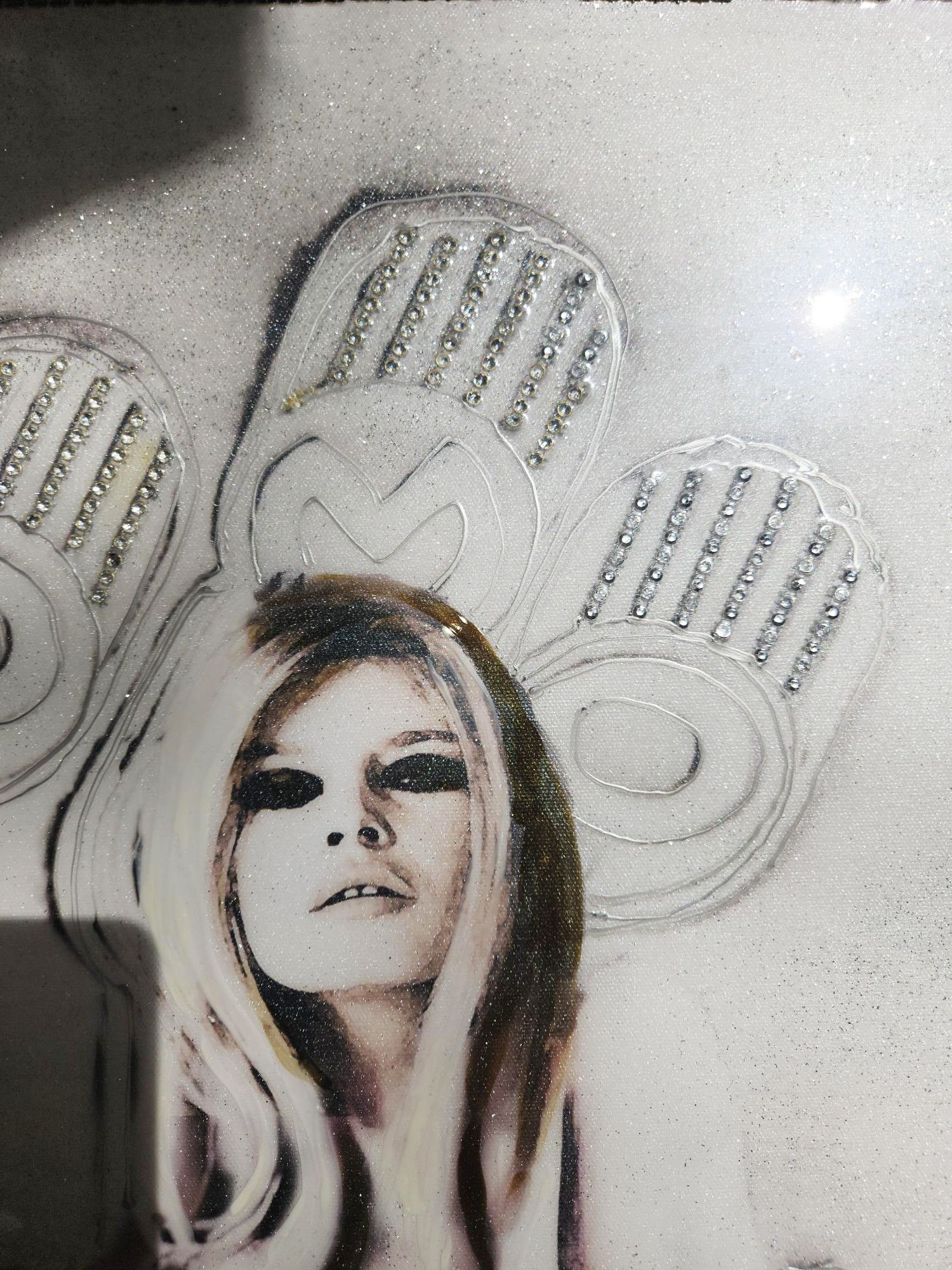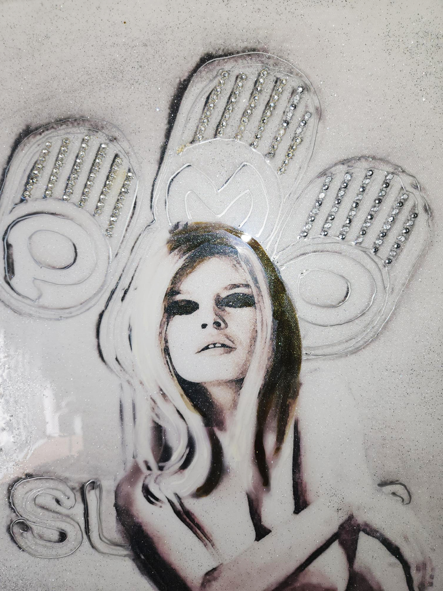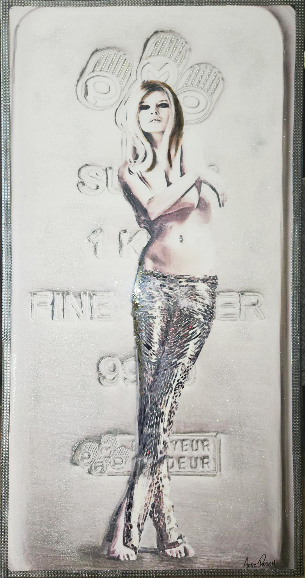 Brigitte Bardot représentée sur un lingot argent.. Peinture et poudre de cristal argent sur peinture acrylique.Cristaux en 3 D ainsi que la peinture sur les écritures.Percing cristal. Effet 3D.En finition,deux couches de résine pour une ultra brillance.