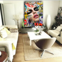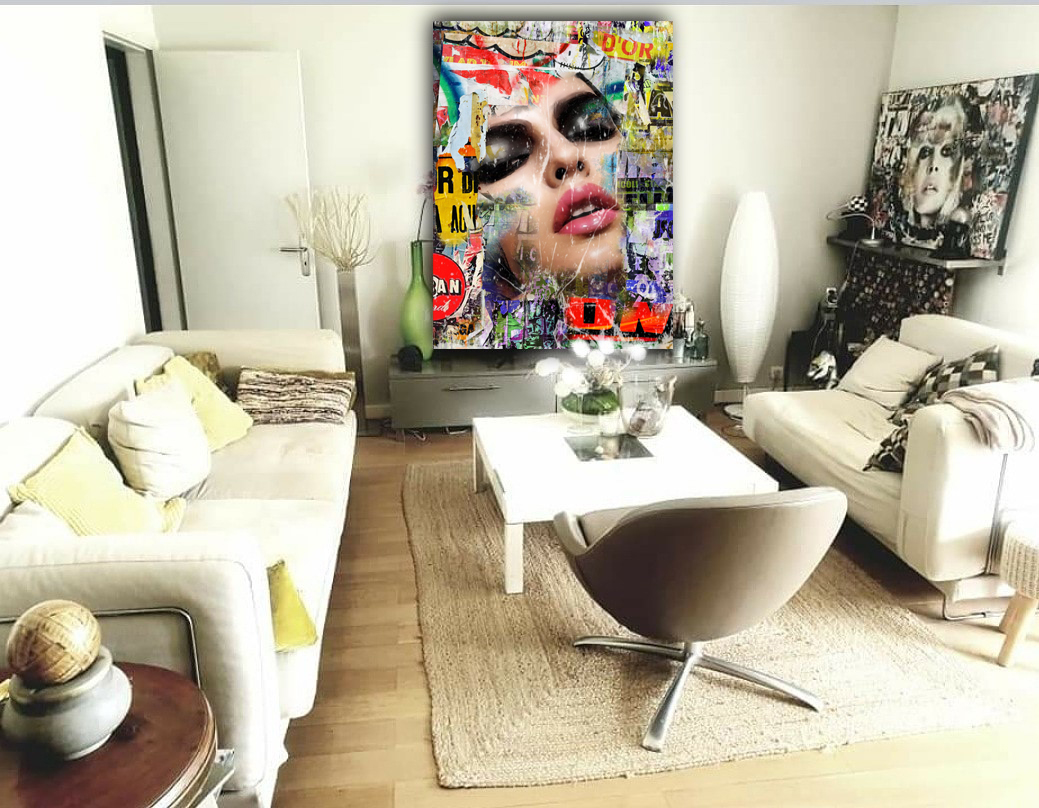 Affiches déchirée et contour de la toile composée de bouchon de champagne avec leur différentes marques,qui contournent le tableau comme un cadre.Peinture et poudre de cristal sur peinture acrylique .Peinture effet 3D.En finition,deux couches de résine pour une ultra brillance.